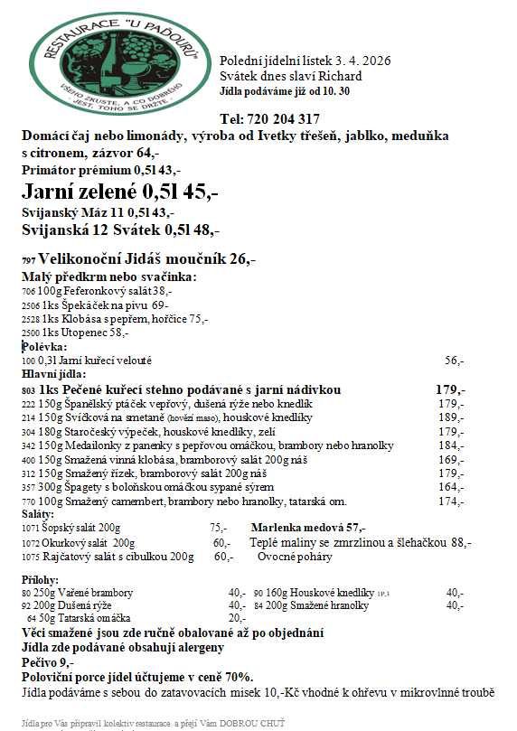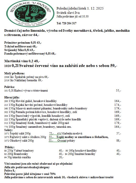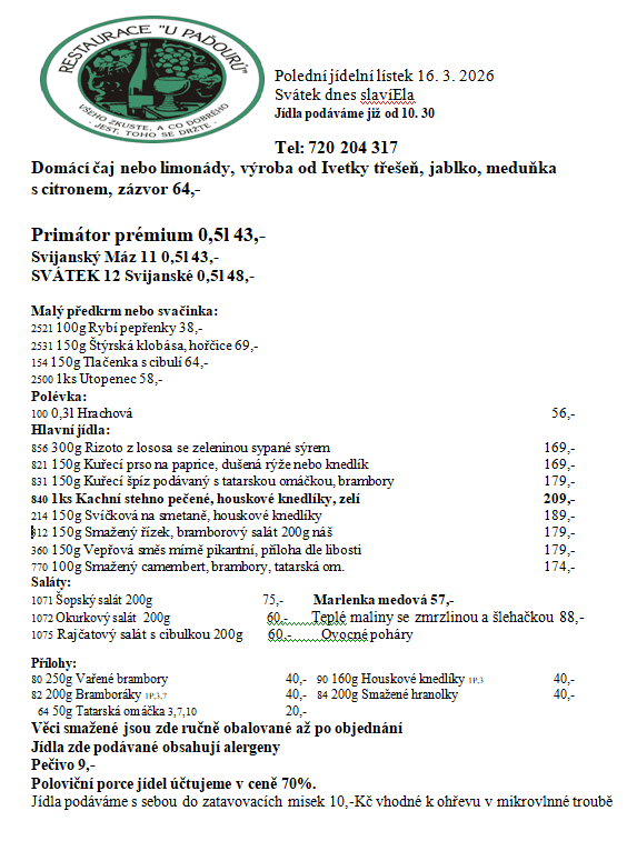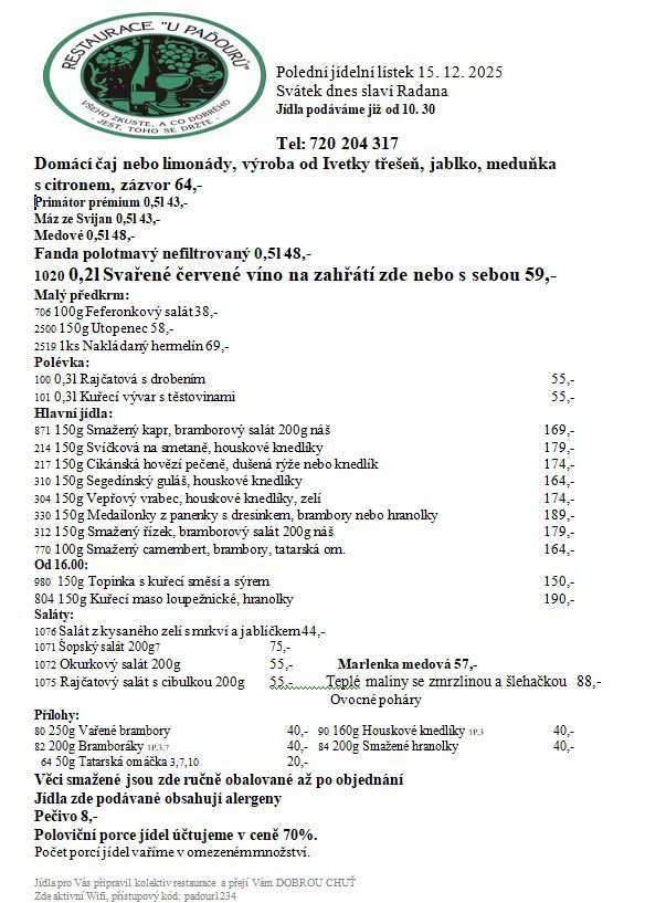 Vaříme pro vás z čerstvých a přírodních surovin a nabízíme vám výborné denní menu i svačiny.