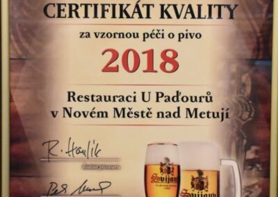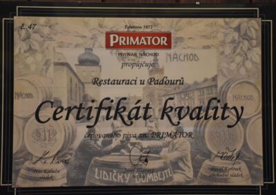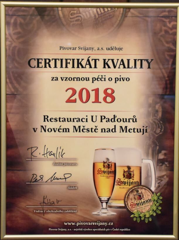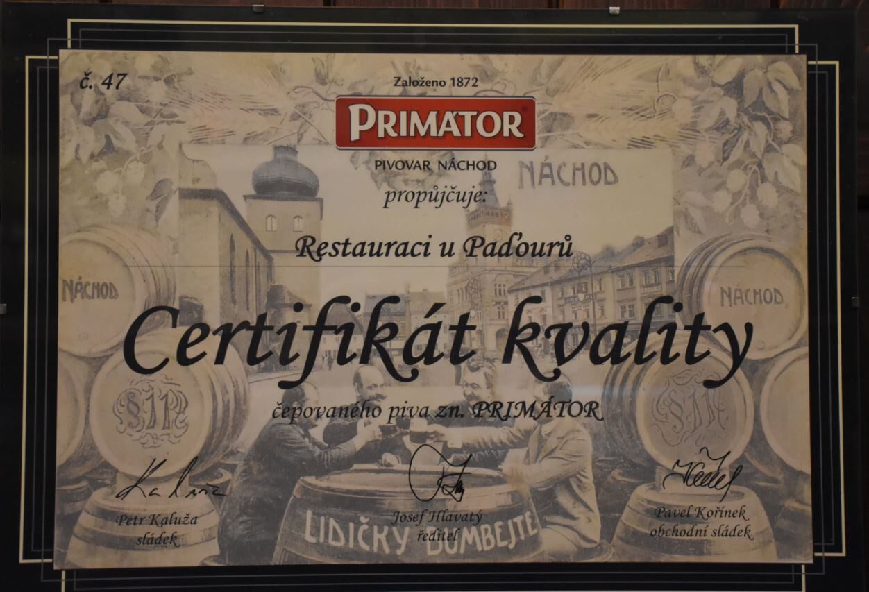 Restaurace u Paďourů je našimi klienty vnímána také jako útulná, kde máte možnost posedět i se svým pejskem. Načepujeme Vám skvělé Svijanské pivo nebo pivo PRIMÁTOR, Kofolu i limo. Na kvalitu piva máme několik certifikátů.